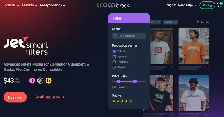 JetSmartFilters is a powerful plugin from Crocoblock, specifically designed to work with Elementor, Gutenberg, and Bricks editors. It offers a wide array of filters and widgets to create a sophisticated and dynamic filtering system. This plugin is ideal for users who are already using Crocoblock’s ecosystem or want a filter solution that integrates deeply with their page builder.