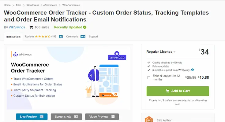 WooCommerce Order Tracker from CodeCanyon offers a visual approach to order tracking by showing customers a progress bar with order stages such as Processing, Shipped, and Delivered. It enhances transparency and keeps customers engaged with real-time shipment updates.