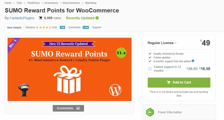 SUMO Reward Points is a highly rated and popular premium plugin available on CodeCanyon. It is part of a suite of plugins that work together to create a full loyalty experience. This plugin is known for its advanced settings and a powerful dashboard that gives administrators full control over every aspect of their reward program, from point expiration to a referral system.